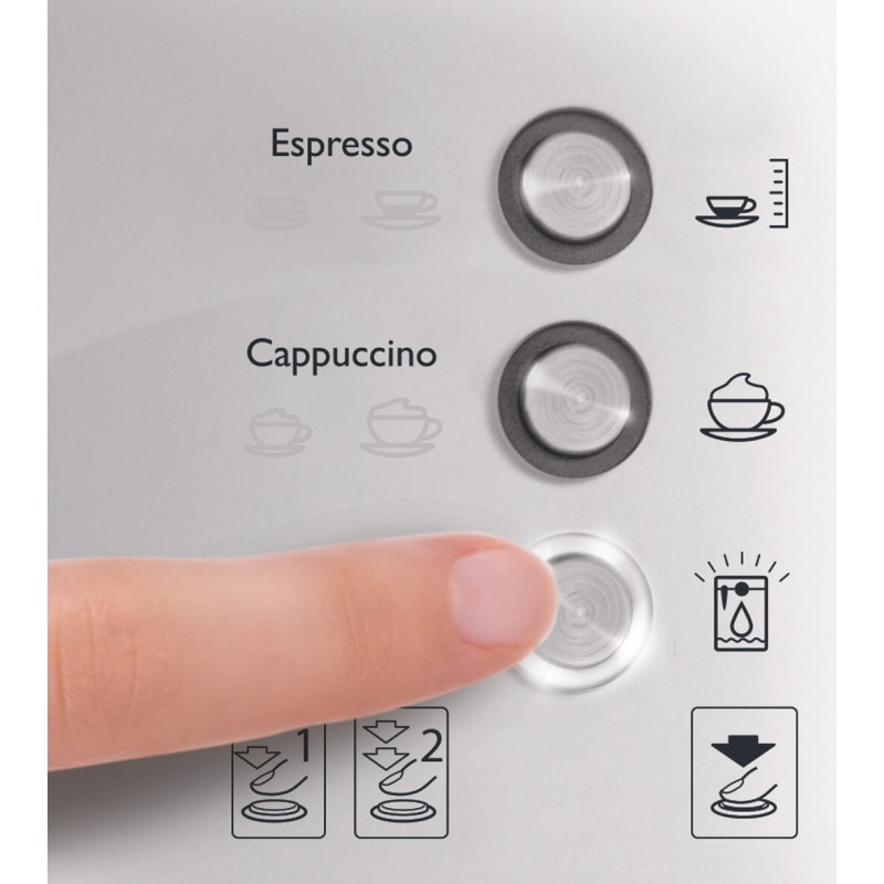 Jednym przyciskiem wybierasz pojedyncze lub podwójne espresso, cappuccino, latte, a podświetlenie wskazuje Twój aktualny wybór.